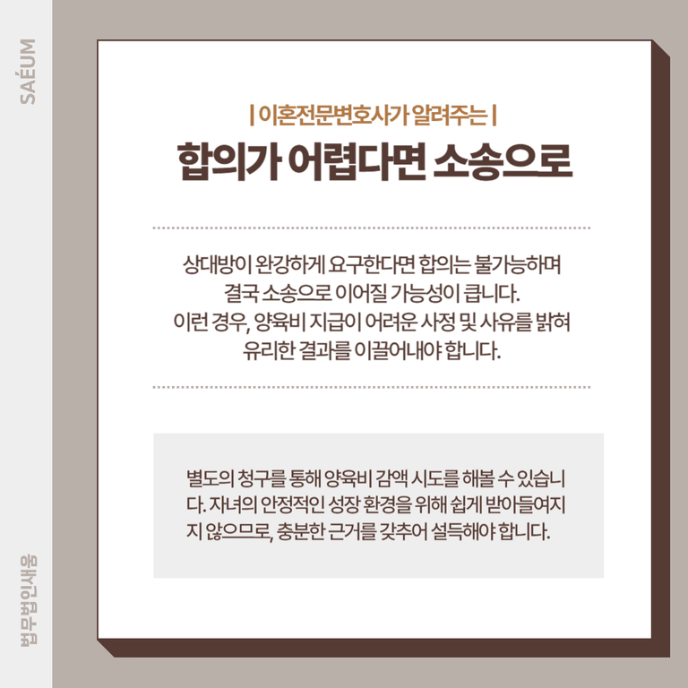 이혼 후에는 법적으로 남이 된 상태이므로, 상대방에게 무조건적인 배려나 양보를 기대하기 어렵습니다. 상대방이 완강하게 과거 양육비 전액 지급을 요구한다면 합의는 불가능하며, 결국 소송으로 이어질 가능성이 큽니다. 이런 경우 양육비를 지급하지 못했던 사정이나 현재 청구 금액을 감당하기 어려운 사유를 명확히 밝혀, 유리한 결과를 이끌어내야 합니다. 이 과정에서 별도의 청구를 통해 양육비 감액을 시도할 수도 있습니다. 다만 앞서 언급했듯 감액은 자녀의 안정적인 성장 환경을 위해 쉽게 받아들여지지 않으므로, 충분한 근거를 갖추어 설득해야 합니다.