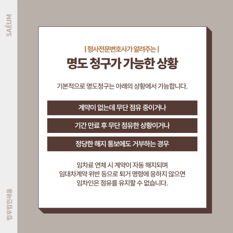 기본적으로 명도청구는 ▲계약이 없는데 무단 점유 중이거나, ▲기간 만료 후 무단 점유, ▲정당한 해지 통보에도 거부하는 경우에 가능합니다.