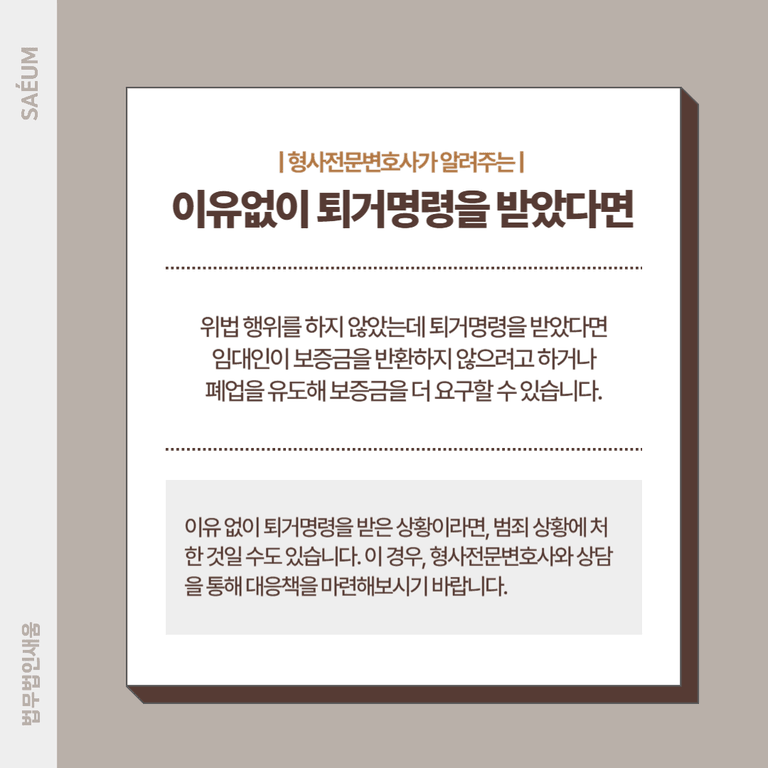 즉, 위법 행위를 하지 않았는데 갑자기 퇴거명령을 받았다면 범죄를 의심해 봐야 합니다. 고의적으로 보증금을 반환하지 않으려고 하거나 폐업을 유도하여 더 많은 보증금을 요구하는 수법일 수 있으므로, 먼저 법률 상담을 받아보시기 바랍니다.