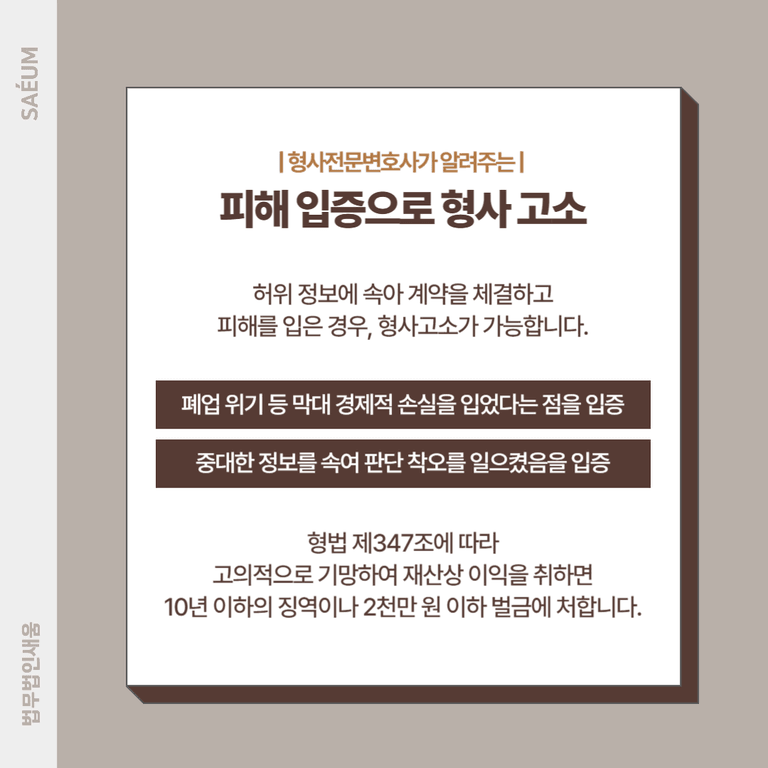 이미 위와 같은 경제적 피해를 입었다면 형사고소를 고려해야 합니다. 양 씨처럼 허위 정보에 속아 계약을 체결하고 피해를 입은 경우, 형사고소가 가능합니다.