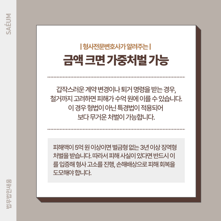 헬스장이나 식당을 임차해 영업하다가 갑작스러운 계약 변경이나 퇴거 명령을 받는 경우, 시설 철거까지 고려하면 피해 금액이 수억 원대에 이를 수 있습니다. 이 경우 형법이 아닌 「특정경제범죄 가중처벌 등에 관한 법률」이 적용되어 무거운 처벌이 가능합니다.