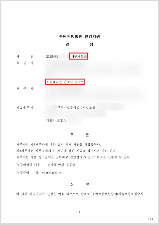의뢰인께서는 전세금을 반환받지 못하셨고, 이에 임대인이 가로주택정비사업을 상대로 가지는 부동산매매대금지급청구권을 가압류하시기를 원하셨습니다. 본안의 소를 제기하시기 전에, 채무자 소유의 재산을 아시는 것이 있다면 가압류는 사전에 필수적으로 진행하셔야 합니다.