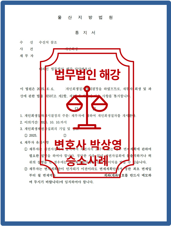법무법인 해강에서는 법리적 검토와 개인회생신청서에 대한 변제계획안 작성등을 통하여 [개인회생개시] 결정 받았습니다.