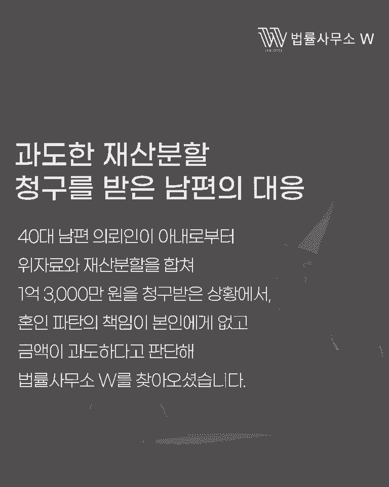 의뢰인은 40대 남편으로, 혼인 기간은 약 10년이었습니다. 아내는 위자료 3,000만 원과 재산분할 1억 원을 청구하며 이혼 소송을 제기했습니다. 의뢰인은 금액이 과도할 뿐 아니라, 혼인 파탄의 주된 책임이 자신에게 있지 않다고 판단해 적극적인 법적 대응을 결심했습니다. 이에 법률사무소 W를 찾아 사건을 의뢰하셨습니다.