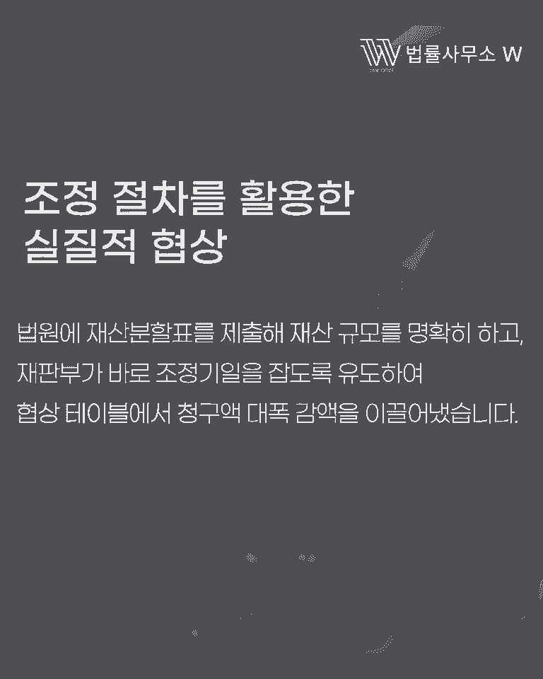 이 사건은 쌍방의 유책성을 명확히 가르기 어려운 상황이었기 때문에, 저는 재산분할 문제를 중심으로 협상을 진행하는 것이 효과적이라고 판단했습니다. 재산이 명확히 정리된 상태에서 조정 절차를 제안했고, 재판부도 이를 수용해 조정기일을 지정했습니다.