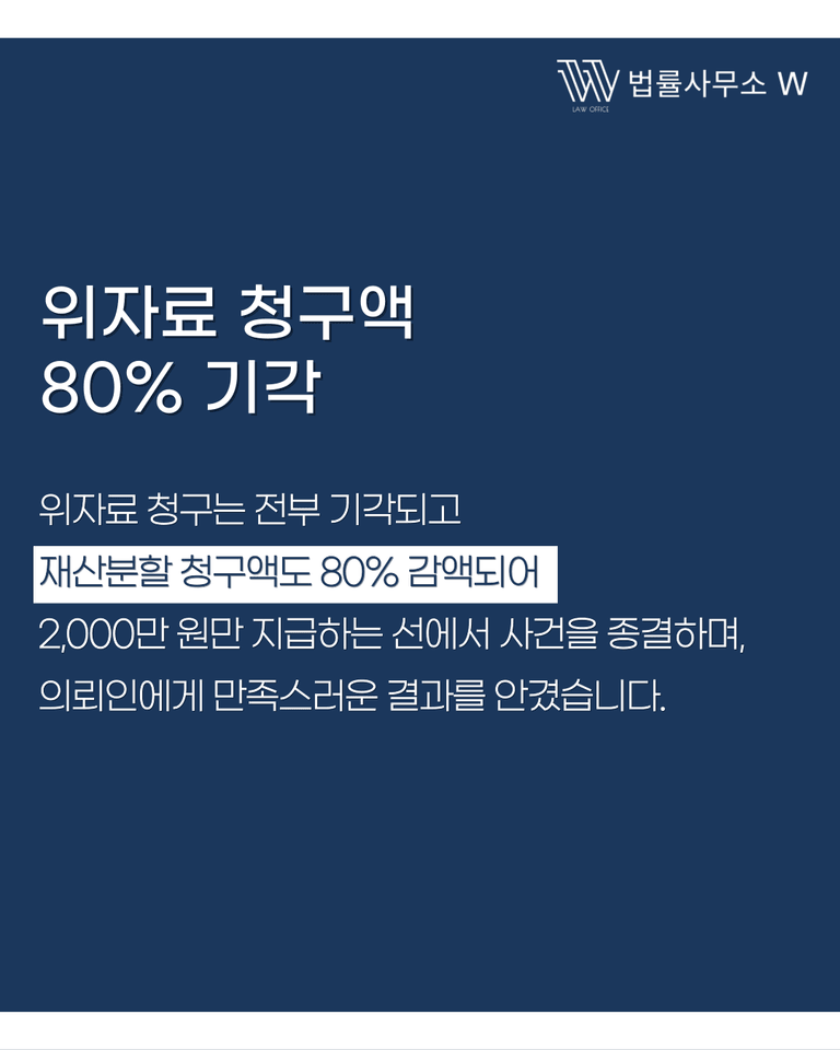 조정 자리에서는 아내의 재산분할 청구액을 80% 줄이고, 최종적으로 2,000만 원만 지급하는 합의안을 이끌어냈습니다. 위자료는 서로 청구하지 않는 것으로 정리됐습니다.