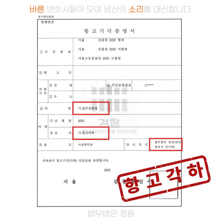 고등검찰청은 법무법인 정음의 주장을 모두 받아들였습니다. 고소인의 항고는 더 이상 검토할 가치가 없는, 이유 없는 불복이라고 판단하여 '항고각하' 결정을 내렸습니다.