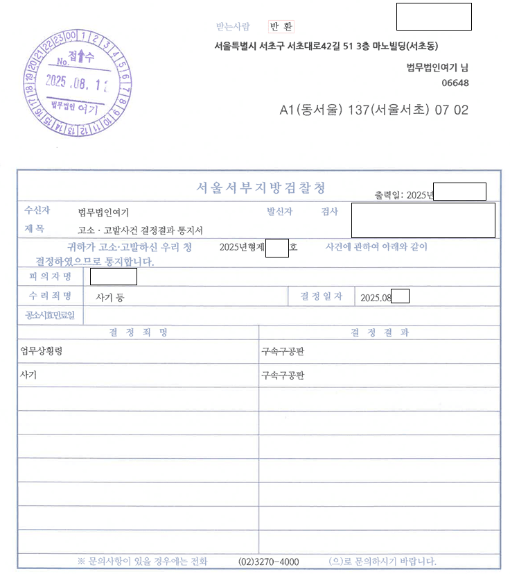 지난번에 경찰에서 송치된 가맹본부 대표 사기 고소사건의 검찰 처분 결과가 나왔습니다. 법인의 대표로 법인의 뒤에 숨어서 범법행위를 한 대표이사를 형사고소를 하였고, 검찰에서 구속상태로 정식기소를 하였습니다. (구속구공판)