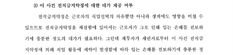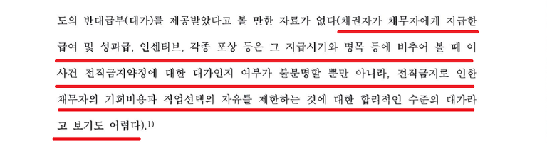 1) 이 사건 전직금지약정서는 '경쟁 기업'의 범위를 특정하지 않고 있으므로, 전직금지대상 기업을 지나치게 광범위하게 설정한 것으로 볼 수 있다. 따라서 이 사건 약정서는 채무자의 근로의 자유를 과도하게 제한하여 무효이다.