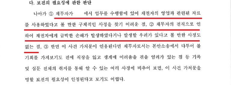 본 사건의 의뢰인께서는 지난 번 소개드린 사건의 채무자보다도 전 직장에서 장기간 근무하셨기 때문에, 본 사건은 채권자의 가처분 신청 인용가능성이 지난 번 사건 보다도 높다고 평가할 수 있는 사건이었습니다.