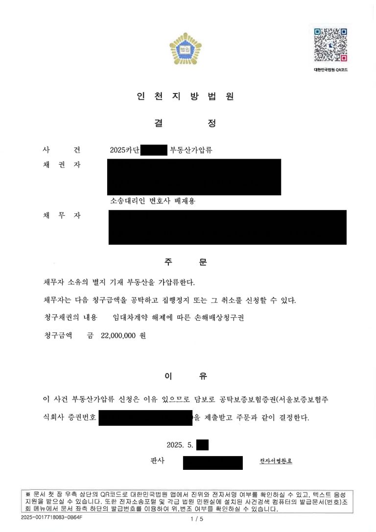 법원은 채권자의 주장을 받아들여, 채무자(임대인) 명의 부동산에 대해 2,200만원 상당의 부동산 가압류 결정을 인용 하였습니다. 이 결정은 본안소송이 진행되기 전 채권자의 채권 회수를 확보할 수 있는 강력한 수단으로 가능하며, 향후 본안 승소 시 강제집행을 위한 법적 기반은 선제적으로 확보한 사례입니다. 본 사건은 임대인 귀책사유로 인한 임대차계약 해제 및 손해배상 청구와 가압류가 동시에 성공한 전형적인 구조로 임차인 권리보호의 모범 사례로 볼 수 있습니다.