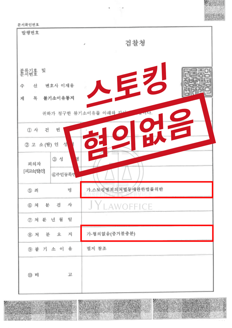 이러한 본 스토킹 전문 변호사의 전략적 대응과 법리적 설득이 주효하여, 수사기관에서는 의뢰인에게 혐의없음의 불기소 처분을 내렸고, 의뢰인은 형사 처벌 없이 무사히 사건을 마무리할 수 있었습니다.