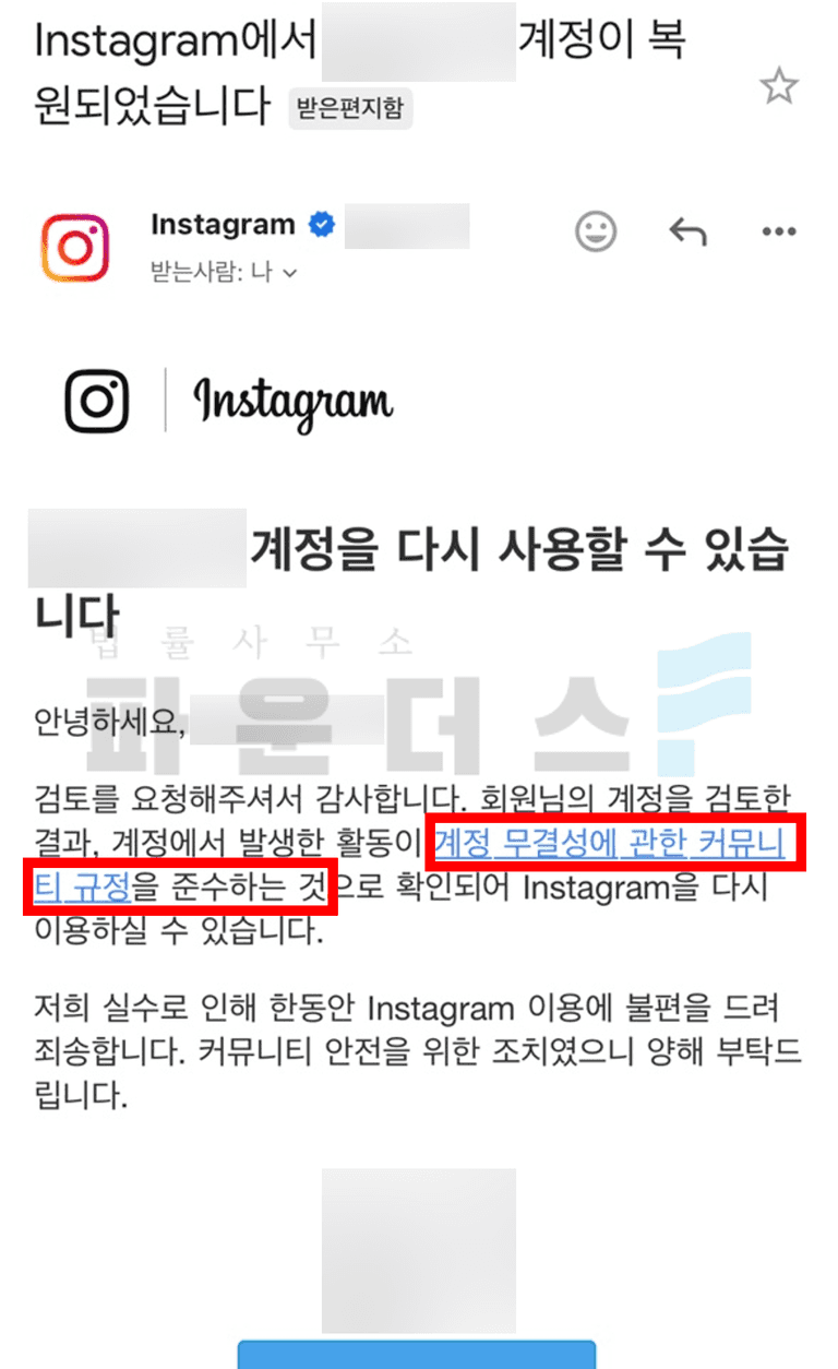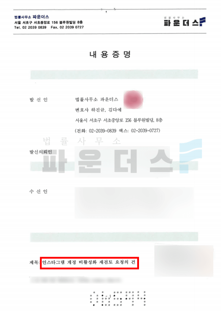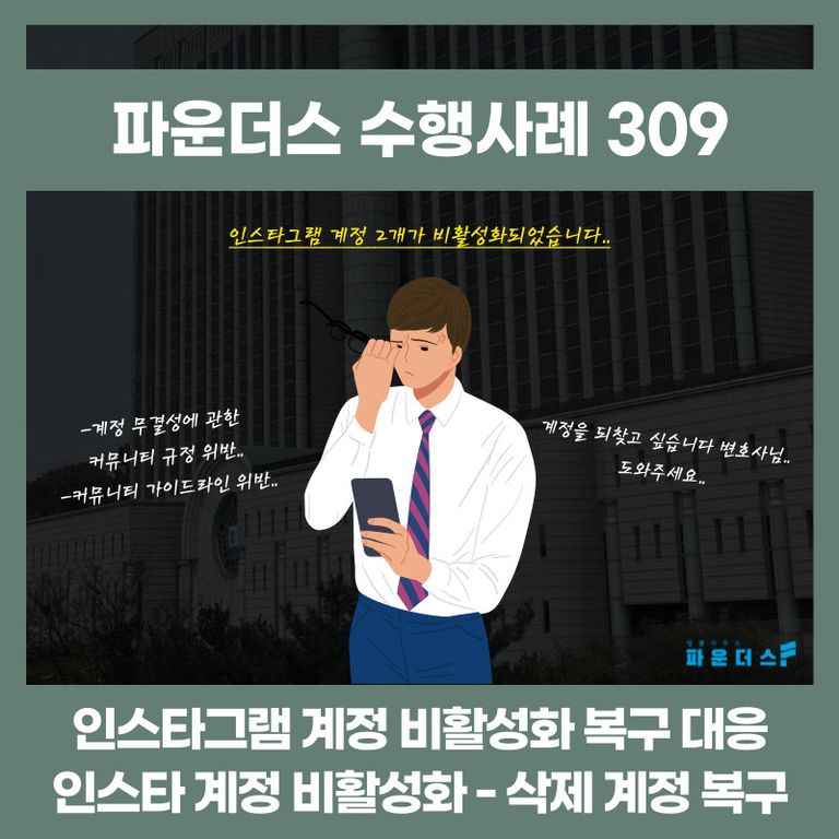 변호인의 조력: 의뢰인은 일상 기록을 목적으로 한 인스타 계정 1개 그리고 비즈니스 계정 1개가 갑작스레 비활성화되어 법적 조력을 요청하였습니다.