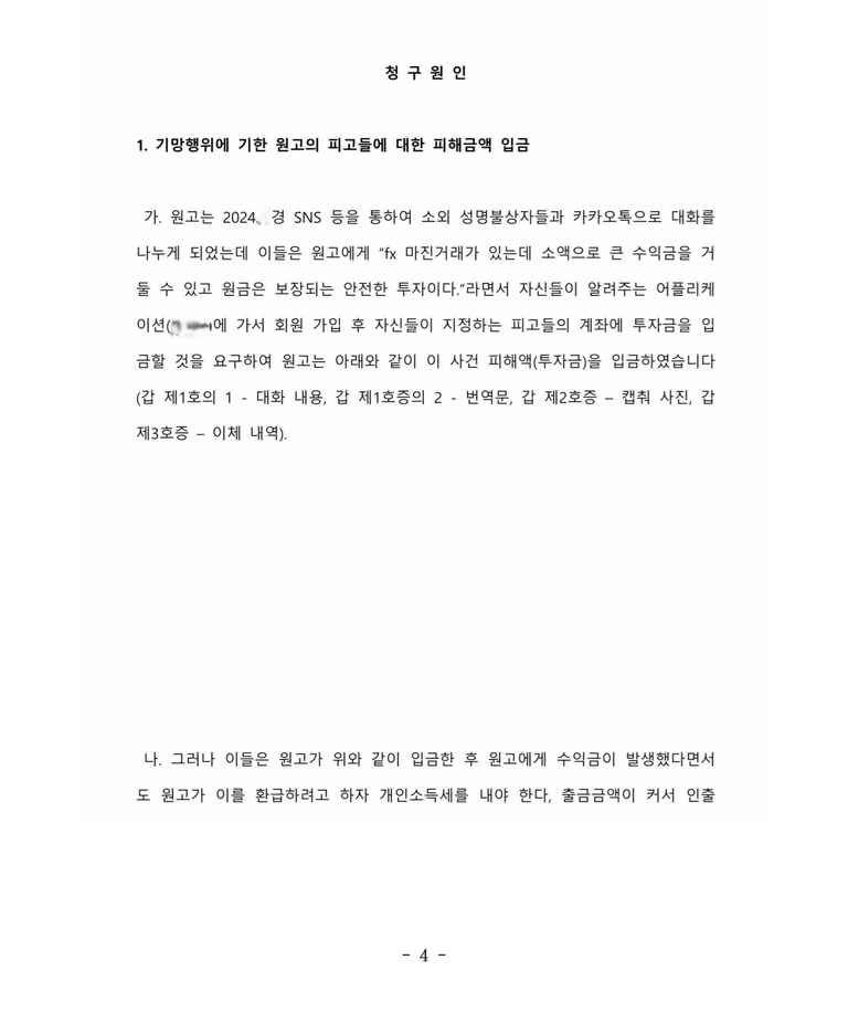 이 사건에서도 의뢰인은 투자사기를 당하여 피고들에게 피해액을 입금하였고 이를 돌려받기 위해 저를 찾아오셨습니다.