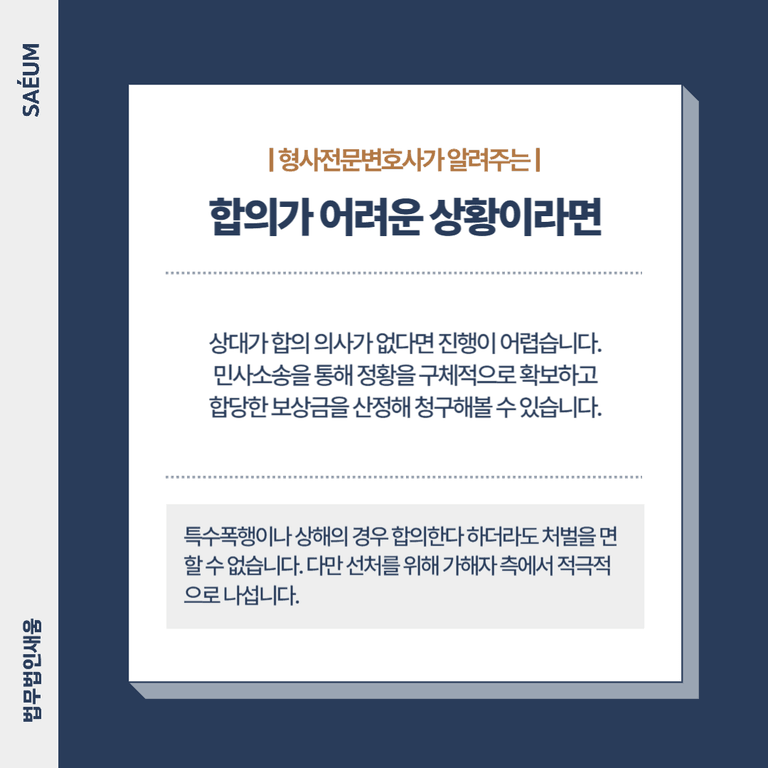 다만 형사합의대리를 맡기더라도 상대방이 전혀 합의 의사가 없다면 합의가 어렵습니다. 이런 경우에는 형사합의대리가 아닌 민사소송을 의뢰하게 되는데, 변호사의 도움을 받아 피해 정황을 구체적으로 확보하고, 합당한 보상금을 산정해 청구한다면 긍정적인 결과를 이끌어낼 수 있습니다. 따라서 합의에 응하지 않거나 터무니없는 합의금을 제시하는 경우, 무리하게 합의하기보다 변호사의 도움을 받아 소송을 진행하는 것이 좋은 방법이 될 수 있습니다.