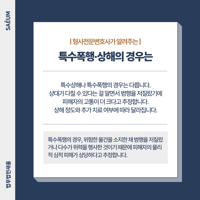 하지만 특수상해나 특수폭행의 경우 상황이 다릅니다. 이 경우 상대방이 크게 다칠 수 있다는 것을 알면서도 위험한 물건을 소지한 채 범행을 저질렀거나, 다수가 위력을 행사한 것이기 때문에 피해자의 고통이 더 크고, 심적인 피해도 상당한 것으로 추정됩니다. 이런 상황에서는 얼마나 다쳤는지, 어느 정도 충격을 받았는지, 그리고 추가 치료가 얼마나 필요한지에 따라 합의금이 달라집니다.