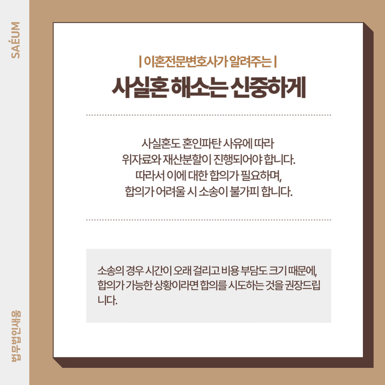 상대방과 합의를 이루는 과정에서 또 다른 갈등이 발생할 수 있고, 누구도 무조건적인 양보를 하고 싶지 않기 때문에 현실적으로 쉽지 않습니다. 그러나 변호사의 도움을 받으면 이 과정이 훨씬 수월해집니다. 상대방을 설득하고 회유하는 과정에서 도움을 받을 수 있을 뿐 아니라, 소송에 대비하는 등 광범위한 지원을 받을 수 있습니다. 사실혼 배우자와 관계 정리 과정에서 어려움을 겪고 있다면, 빠르게 법률 자문을 받아 대응하시기 바랍니다.