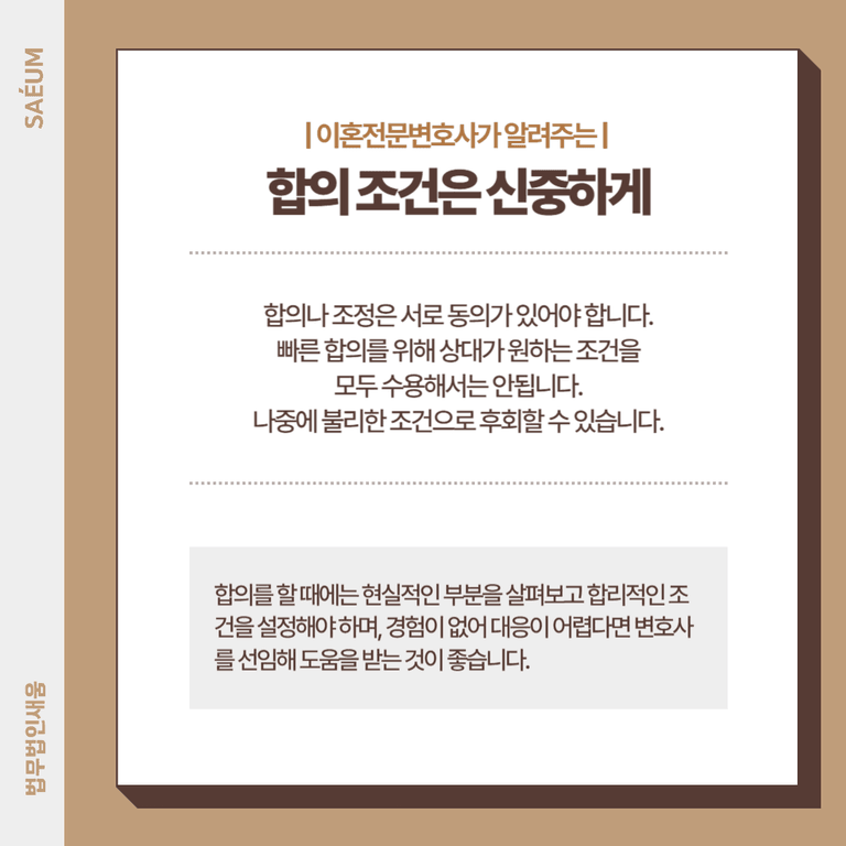 다만 합의나 조정을 위해서는 서로 간 동의가 있어야 합니다. 동의를 구하지 못하면 결국 합의이혼은 진행이 어렵고 소송으로 이어집니다. 합의가 가능하더라도 무작정 상대방이 원하는 조건을 모두 수용해서는 안 됩니다. 이렇게 하면 합의를 이루기는 쉬울 수 있지만, 나중에 불리한 조건으로 인해 후회할 수 있기 때문입니다. 따라서 합의를 할 때에는 현실적인 부분을 살펴보고 합리적인 조건을 설정해야 하며, 경험이 없어 대응이 어렵다면 변호사를 선임해 도움을 받는 것이 좋습니다.