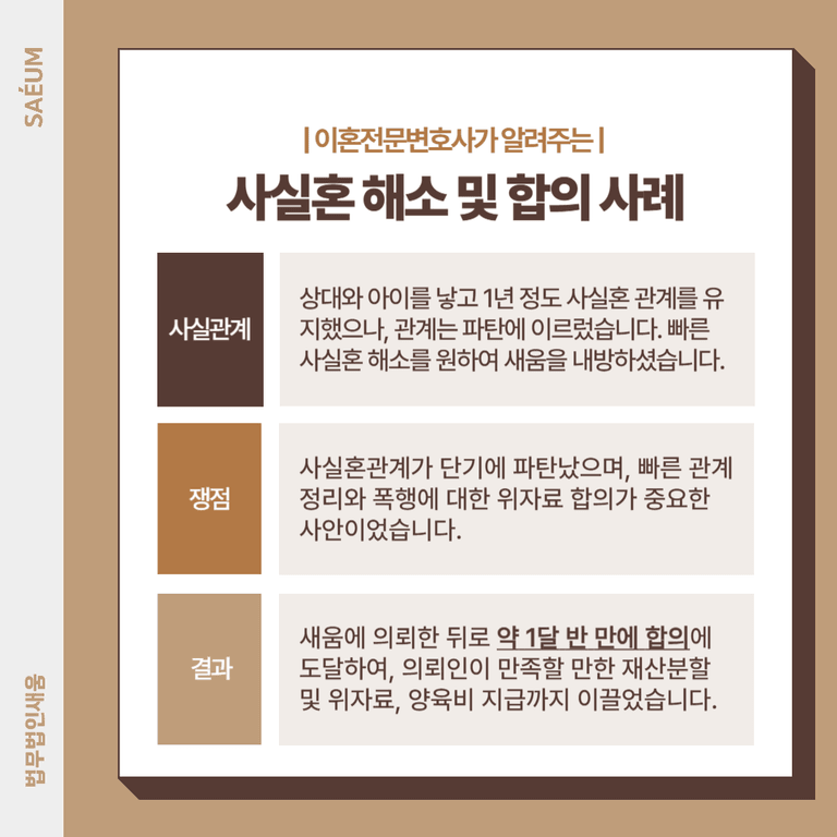 의뢰인 A씨는 사실혼 관계였던 배우자와 사이에서 아이를 낳고 1년 정도 혼인관계를 유지했습니다. 그러나 관계가 파탄에 이르렀고, 빠른 정리를 원해 본 법무법인 새움을 찾았습니다.