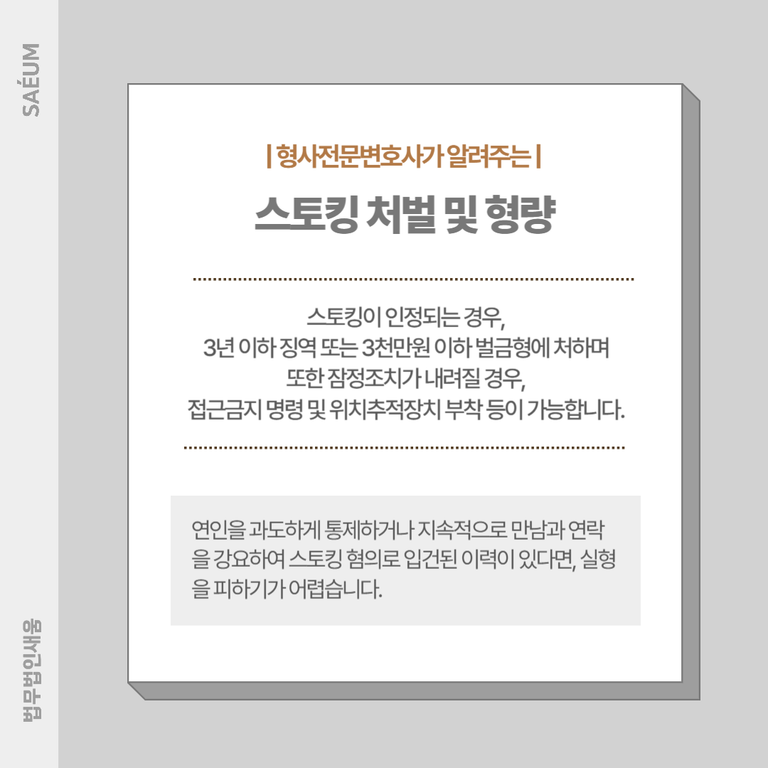 특히 과거 연인을 과도하게 통제하거나 지속적으로 만남과 연락을 강요하여 스토킹 혐의로 입건된 이력이 있다면, 실형을 피하기가 어렵습니다. 스토킹은 과거 경범죄로 취급되던 시절과 달리, 현재는 ‘스토킹범죄의 처벌 등에 관한 법률’에 따라 성립하는 엄연한 강력범죄입니다.