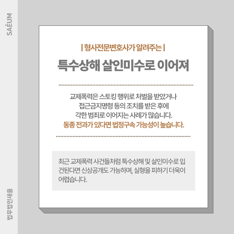 문제는 이러한 조치를 받은 이후에도 일방적인 이별 통보로 인해 연인을 잊지 못하고 과격한 행동을 하거나 찾아가서 만남을 강요한다면, 더 심각한 범죄로 이어질 수 있다는 점입니다. 서두의 사건들처럼 살인미수나 특수상해죄로 입건된다면 실형을 피하기 어렵습니다.