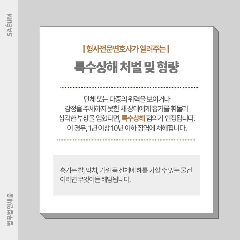 또한 울산 사건처럼 감정을 주체하지 못한 채 상대에게 흉기를 휘둘러 심각한 부상을 입혔다면, 특수상해 혐의가 인정됩니다. 해당 범죄는 형법 제257조에 따라, 단체 또는 다중의 위력을 보이거나 위험한 물건을 휴대해 상해를 입힌 경우 성립합니다.
