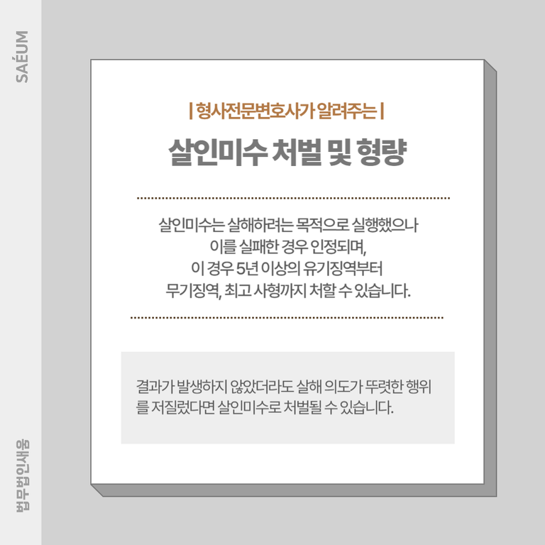 참고로 살인미수죄는 형법 제254조에 의해 성립하며, 사람을 살해하려는 목적을 가지고 실행에 착수했으나 실패한 경우 인정됩니다. 결과가 발생하지 않았더라도 살해 의도가 뚜렷한 행위를 저질렀다면, 사형, 무기징역 또는 5년 이상의 유기징역에 처해집니다.