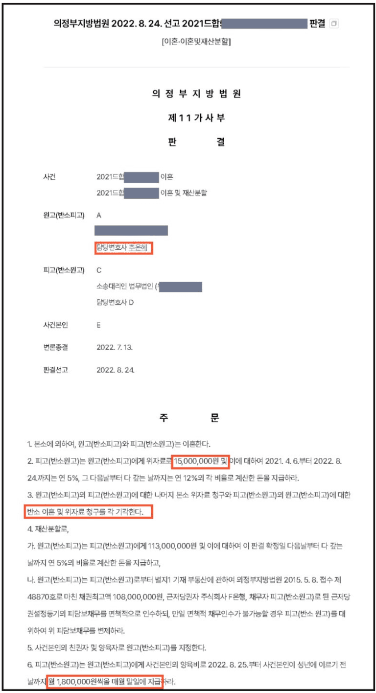 상대방의 유책 사유를 명확히 인정하여 의뢰인에게 위자료 1,500만 원 지급 판결