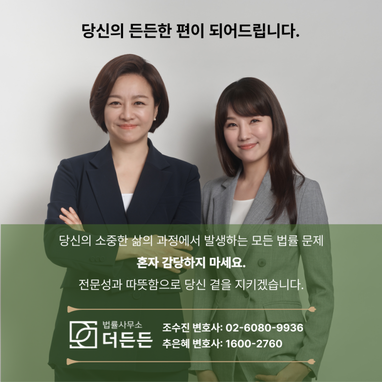 풍부한 경험과 전문성을 갖춘 더든든 법률사무소와 함께 하시기 바랍니다. 당신의 정당한 권리를 지키고, 새로운 삶의 시작을 든든하게 응원하겠습니다. 로블리 추은혜 였습니다. :)