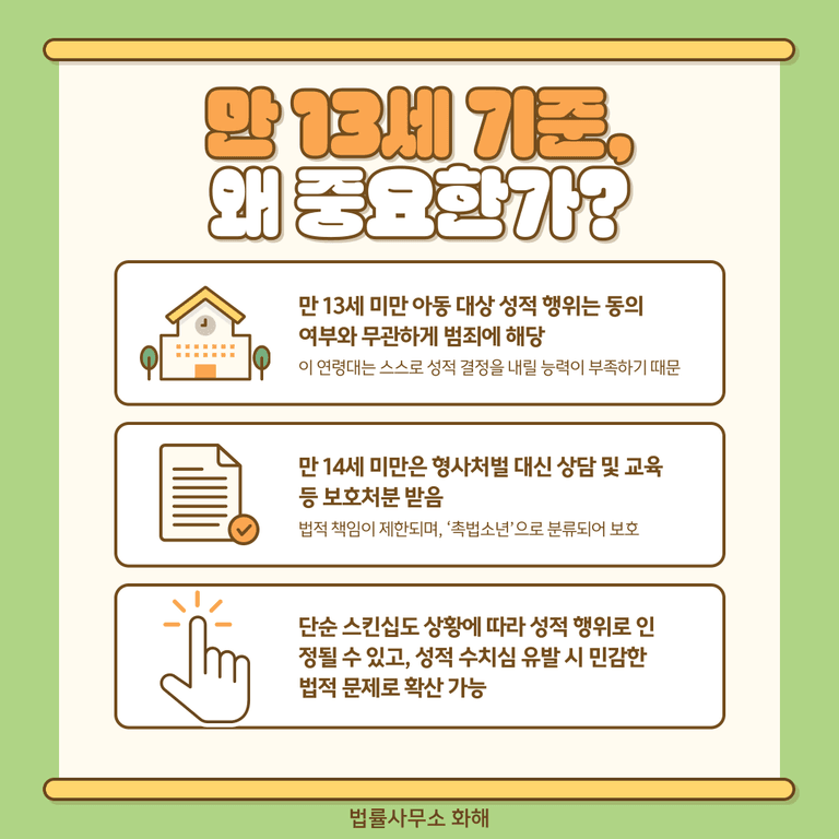 먼저 중학생과 초등학생이 사귀면서 신체적 접촉이나 성적인 행동이 일어나는 상황을 가정해 보겠습니다. 이때 법적으로 가장 중요한 기준은 만 13세입니다. 우리나라 「아동·청소년의 성보호에 관한 법률」은 만 13세 미만의 아동을 대상으로 한 모든 성적 행위는 그 아이가 동의했더라도 범죄로 규정합니다. 이는 만 13세 미만 아동은 성적인 결정을 스스로 내릴 수 있는 능력이 부족하다고 보기 때문으로, 미성년자에게 음주나 흡연을 금하는 것과 같은 취지라고 할 수 있습니다.