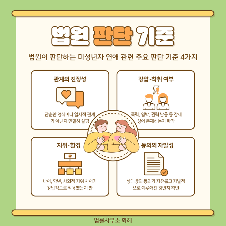 이에 아동&청소년 교제와 관련한 법적 문제를 전문적으로 다루는 법률사무소 화해에서, 미성년자들 사이의 연애에 관련된 법적 쟁점들을 자세히 설명드리고자 합니다.