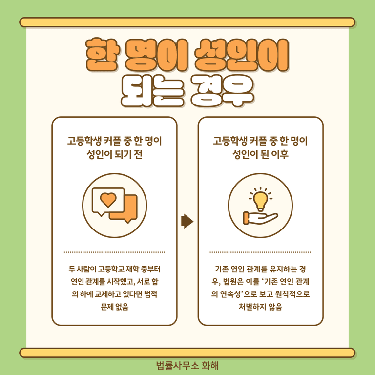 고등학생 커플 중 한 명이 성인이 되는 경우 또한 흔히 있는 상황입니다. 예를 들어 고등학교 3학년 학생과 1학년 학생이 사귀다가, 3학년 학생이 졸업하여 성인이 된 경우를 생각해 볼 수 있습니다. 많은 분들이 이럴 때 “아동·청소년의 성보호에 관한 법률 때문에 처벌받는 것은 아닐까?” 하고 걱정시는데요.