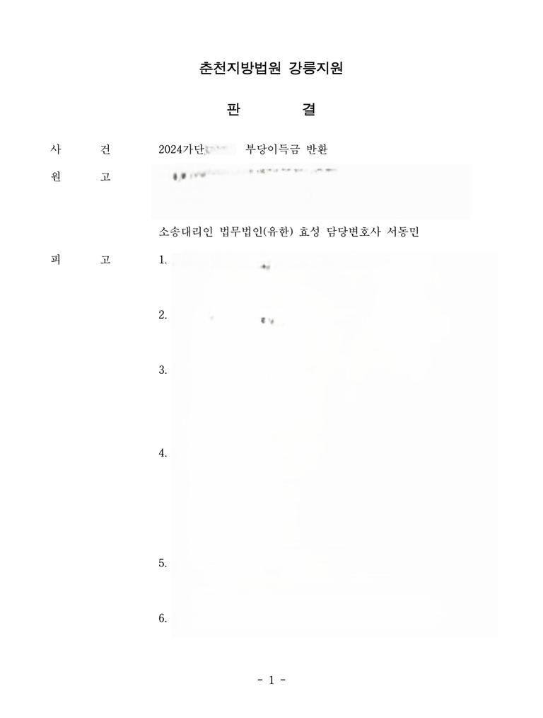 저는 즉각 입금 받은 자들을 피고로 하여 민사소송 부당이득반환청구소송을 제기하였고 법원은 원고 승소 판결을 선고하여 의뢰인은 피해액을 반환받게 되었습니다.