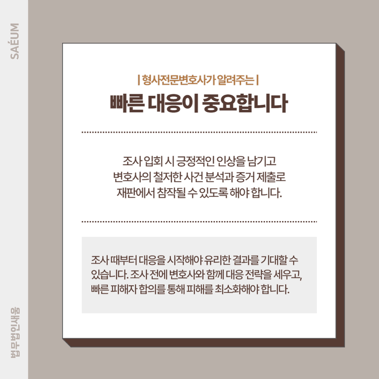이를 위해서는 본격적인 조사 전에 변호사 상담을 받아 대응 전략을 세우고, 빠른 피해자 합의를 통해 피해를 최소화하는 것이 중요합니다.