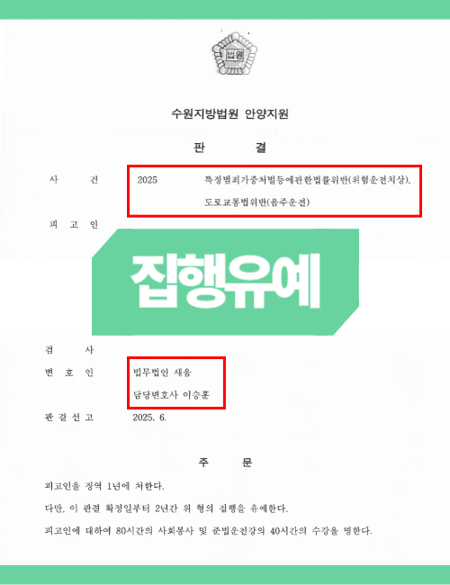 이 사건은 단순 위험운전치상에 그치지 않았습니다. A씨는 음주운전 전과가 있었고, 술을 마신 후 상당한 거리를 주행했으며, 혈중알코올농도가 0.08% 이상으로 면허취소 수치에 해당하는 등 불리한 사정이 많았습니다. 실형 가능성이 상당했음에도, 참작 사유를 충분히 마련한 덕분에 징역 1년과 2년간 집행유예, 사회봉사, 준법운전교육 이수 명령을 선고받았습니다.