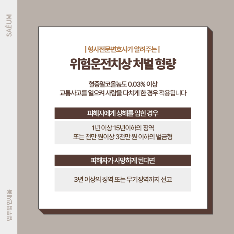 사고를 내거나 문제를 일으킨 것이 아니더라도 술을 마시고 운전하는 행위 자체만으로 처벌의 대상이 됩니다. 특히 음주운전으로 인한 피해가 끊이지 않고 있는 상황이기 때문에 쉽게 선처를 받기 어려운 것이 사실입니다. 심지어 이 과정에서 사고를 일으켜 사람을 다치게 한 경우, 위험운전치상으로 특가법위반 처벌을 받을 수 있습니다.