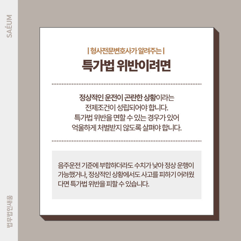 따라서 혈중알코올농도가 음주운전 기준에 부합하더라도 수치가 낮아 정상 운행이 가능했거나, 정상적인 상황에서도 사고를 피하기 어려운 조건에서 사고가 발생했다면 술이나 약물의 영향으로 발생한 사고가 아니므로 특가법위반 처벌을 면할 수 있습니다. 억울한 처벌이 내려지지 않도록 사건 상황을 면밀히 살펴야 합니다.