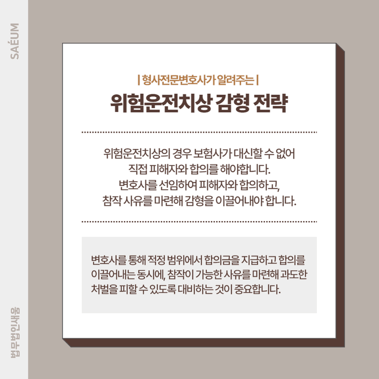 음주운전 자체가 사회적으로 큰 문제를 일으키는 행위이기 때문에, 위험운전치상의 경우에도 선처를 받기가 어렵습니다. 특히 일반 교통사고와 달리 보험사가 대신 사건을 정리하거나 피해자와의 합의를 진행할 수 없습니다. 따라서 직접 피해자와 합의를 해야 하며, 합의를 하지 않았거나 피해자로부터 용서를 받지 못한 경우 선처 가능성이 떨어집니다.