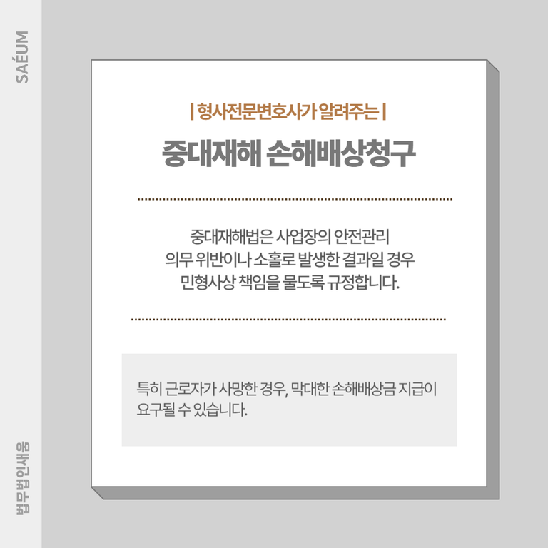 중대재해법은 사업장의 안전관리 의무 위반이나 소홀로 발생한 결과일 경우 민형사상 책임을 물도록 규정합니다. 특히 근로자가 사망한 경우, 막대한 손해배상금 지급이 요구될 수 있습니다.