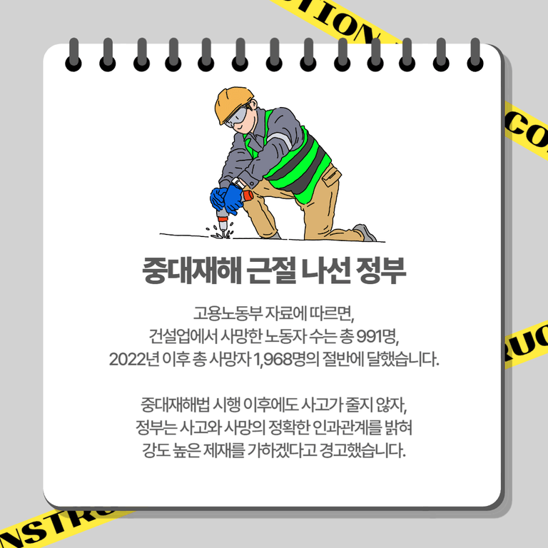 건설업에서 사망한 노동자 수는 총 991명으로, 2022년 이후 현재까지 총 사망자 1,968명의 절반에 달했습니다. 이에 정부는 중대재해법 시행 이후에도 사고가 줄지 않는다며, 사고와 사망의 정확한 인과관계를 밝혀 강도 높은 제재를 가하겠다고 엄중히 경고했습니다.