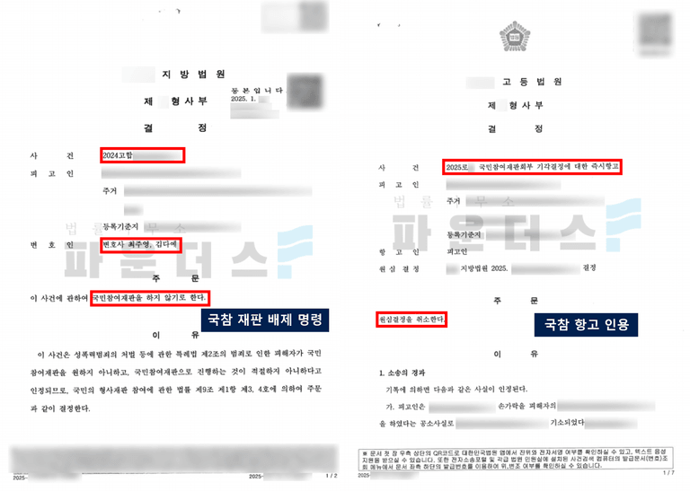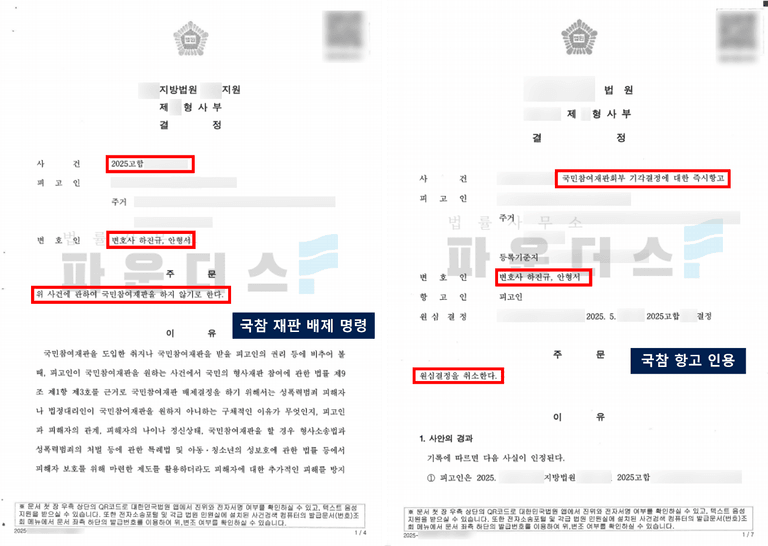 그 결과 두 사건 모두 국민참여재판 배제명령 이후 항고 절차를 통해 고등법원에서 직권으로 배제 결정을 취소하는 “인용”의 결과를 받을 수 있었습니다.