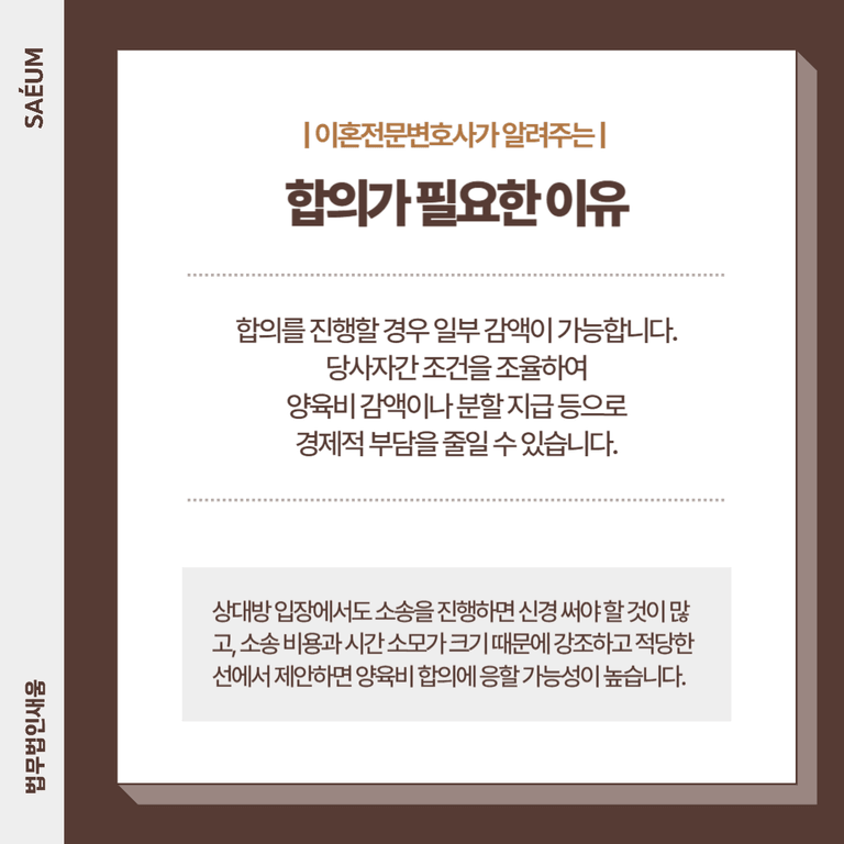 양육비 합의는 생각처럼 쉽지 않습니다. 특히 양육비 감액을 원하는 경우 상대방이 이를 반대하고 강경하게 나올 위험이 있는데요. 따라서 합당한 사유를 기반으로 설득하여 원하는 결과를 이끌어내야 합니다. 만일 이전에 감정이 좋지 않아 양육비 합의가 어려운 상황이라면 변호사의 도움을 받아 상대방을 설득해 볼 수도 있습니다.