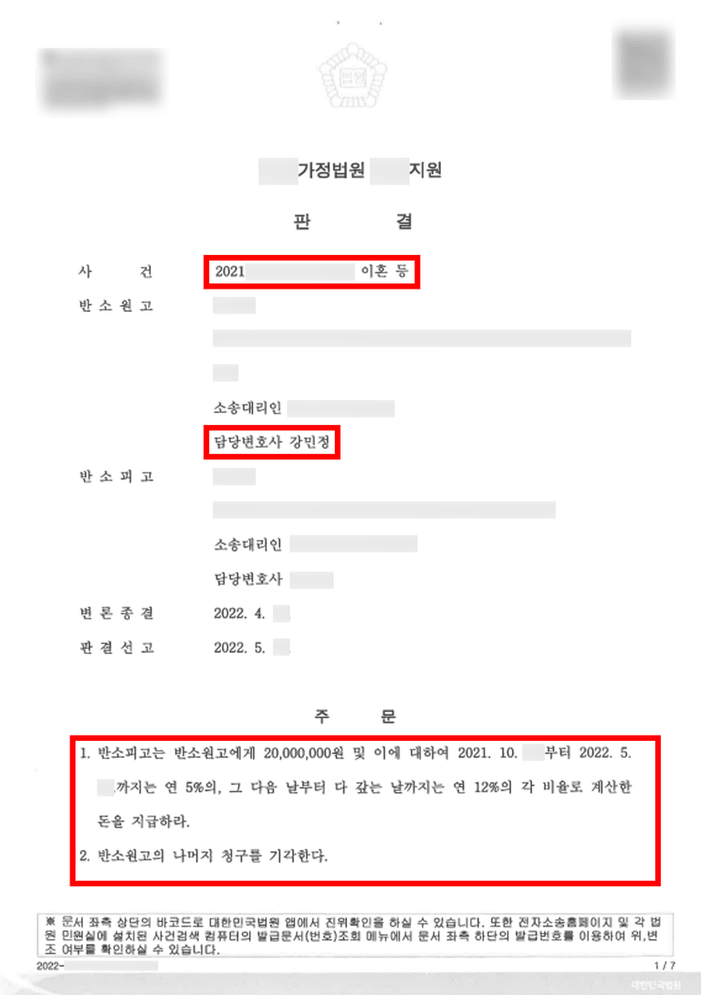 판결문에서 법원은 배우자의 부정행위가 혼인 파탄의 원인임을 인정, 의뢰인에게 총 2,000만 원의 위자료 지급을 확정시켰습니다.