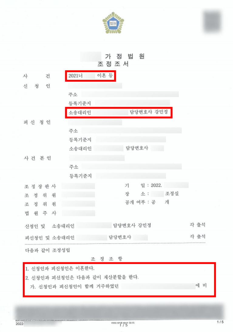 이번 사건에서 저는 신청인(아내) 측의 법률대리인으로서, 혼인관계 파탄 이후 이혼 및 재산분할, 양육권, 양육비 등 가정법률 쟁점을 종합적으로 조력하여 조정합의를 이끌었습니다.