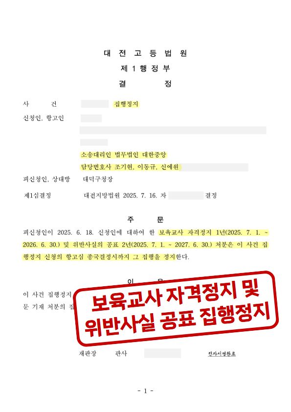 재판을 통해 시비를 다투는 동안 처분이 그대로 집행돼버리면, 그동안 받는 손해와 주변의 시선은 쉽게 회복되지 않습니다.
