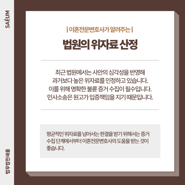 또한 법원은 상간행위로 인해 정신적·경제적 고통을 준 정도에 따라 위자료를 산정합니다. 최근에는 상간소송에서 물가상승과 사안의 심각성을 반영해 과거보다 높은 위자료를 인정하는 사례가 늘고 있습니다.