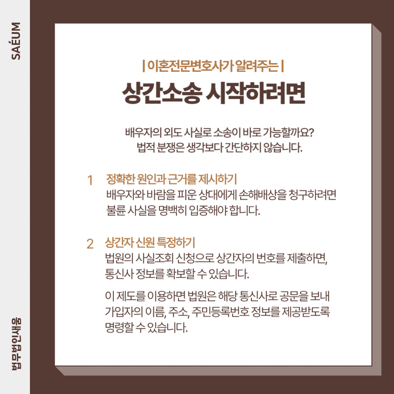 만약 배우자의 외도로 큰 고통을 받았음에도, 소송 절차·기간·비용·상간자 정보 확인 방법 등으로 인해 주저하고 있다면 그대로 포기해서는 안 됩니다. 나의 권리를 주장하고 정당한 보상을 받기 위해, 상간소송 경험이 풍부한 전문 변호사의 조력을 받으시기 바랍니다.