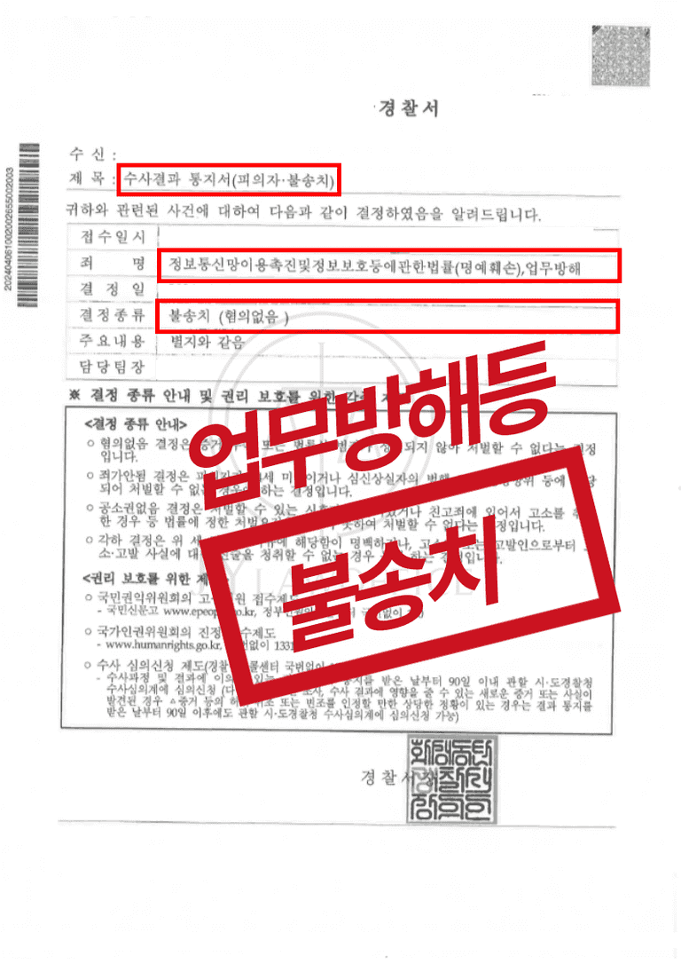 이와 같은 본 형사 전문 변호사의 조력에 따라, 의뢰인은 업무방해 및 명예훼손 혐의를 받았지만 불송치 처분을 받으며 사건을 무사히 마무리할 수 있었습니다.