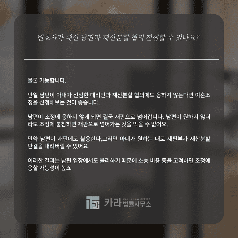 협의이혼에는 동의하나 재산분할에 소극적인 남편, 변호사가 대신 남편과 재산분할 협의 진행할 수 있나요?
