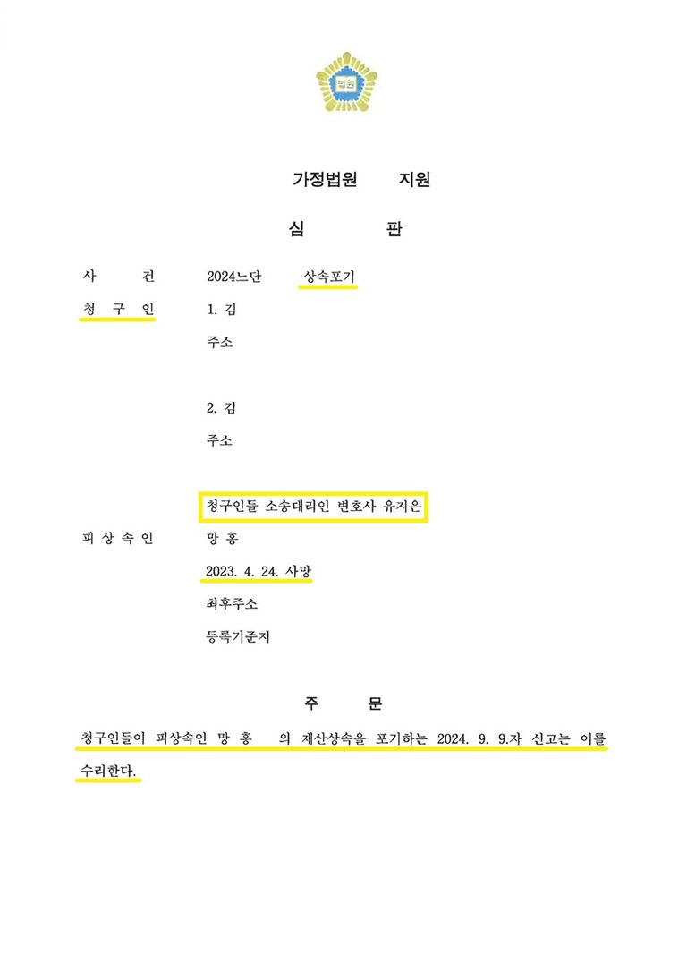 심판청구를 한 날로부터 한 달도 되지 않아 상속포기 신고를 모두 수리한다는 심판문을 받았고, 이 심판문을 진행 중인 소송에 제출함으로써 의뢰인의 상속 문제를 말끔하게 해결하였습니다.